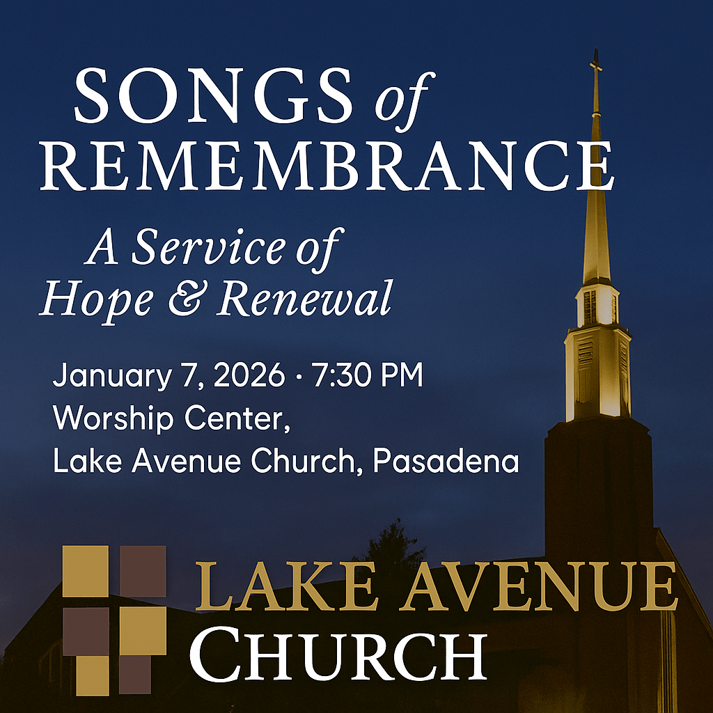 Lake Avenue Church in Pasadena invites you to Songs of Remembrance: A Service of Hope and Renewal, marking the first anniversary of the fire that devastated our neighborhood. This special evening will feature sacred hymns, choral anthems, and classical selections, along with a message of grace and healing from Philip Yancey, acclaimed author of Where Is God When It Hurts? and Disappointment with God.